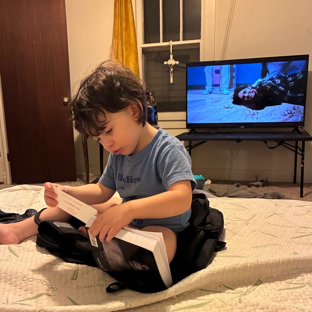 I see making and enjoying art as a type of spirutal practice. This book inspired me and I leave you with this below. I am even worse at visual art than I am at book reviews but my toddler was facinsated with the book while I rewatched SMILE. Feeling inspired by his curosity and the iconic first death, I took a picture capturing innocence and death. Evil and death starred back at the screen and I smiled remembering life and art is a gift.